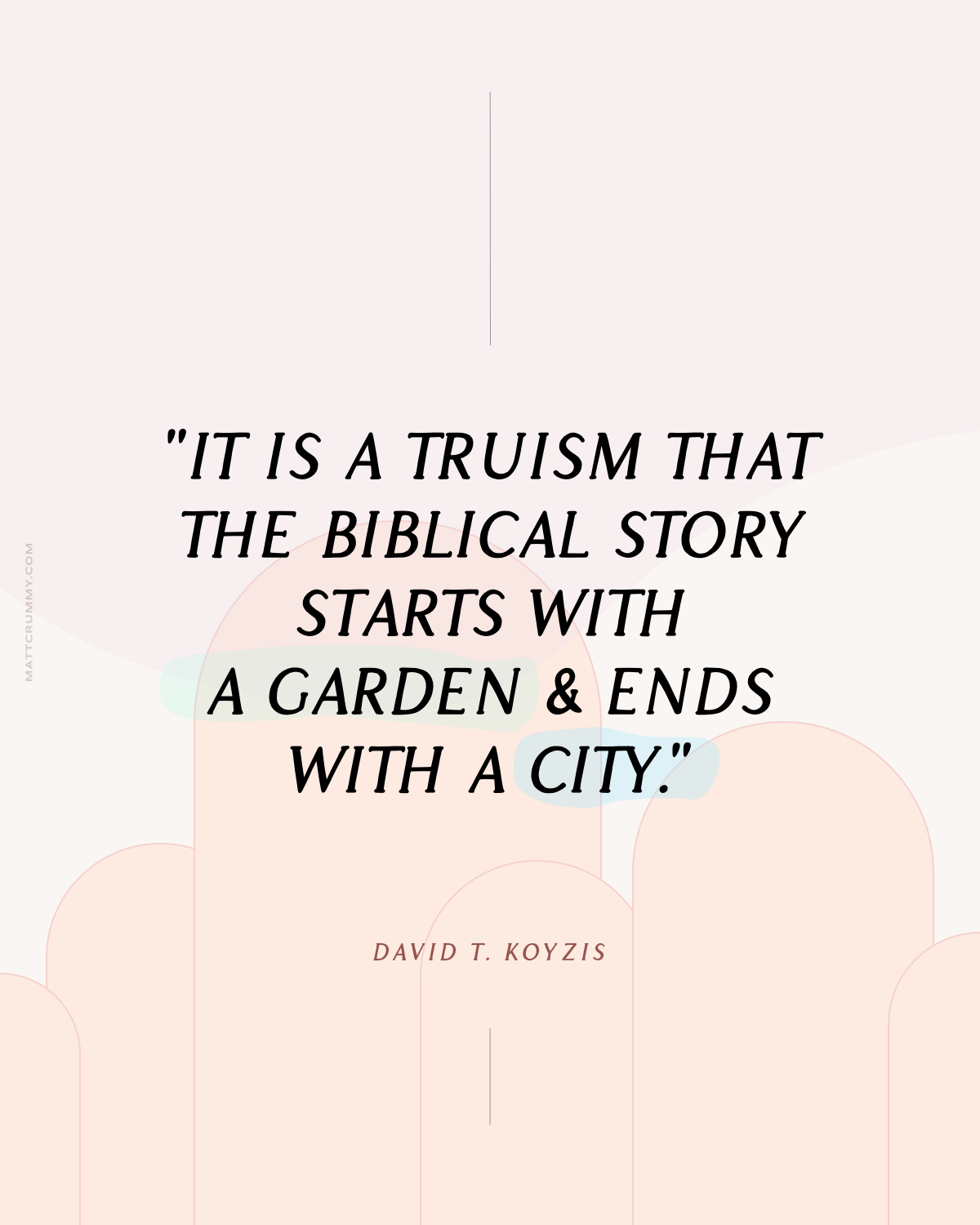 "It is a truism that the biblical story starts with a garden and ends with a city. Redeemed humanity does not return to Eden; it enters the new Jerusalem, with the saving work of Jesus Christ paving the way, reordering our cultural activities to God's glory."