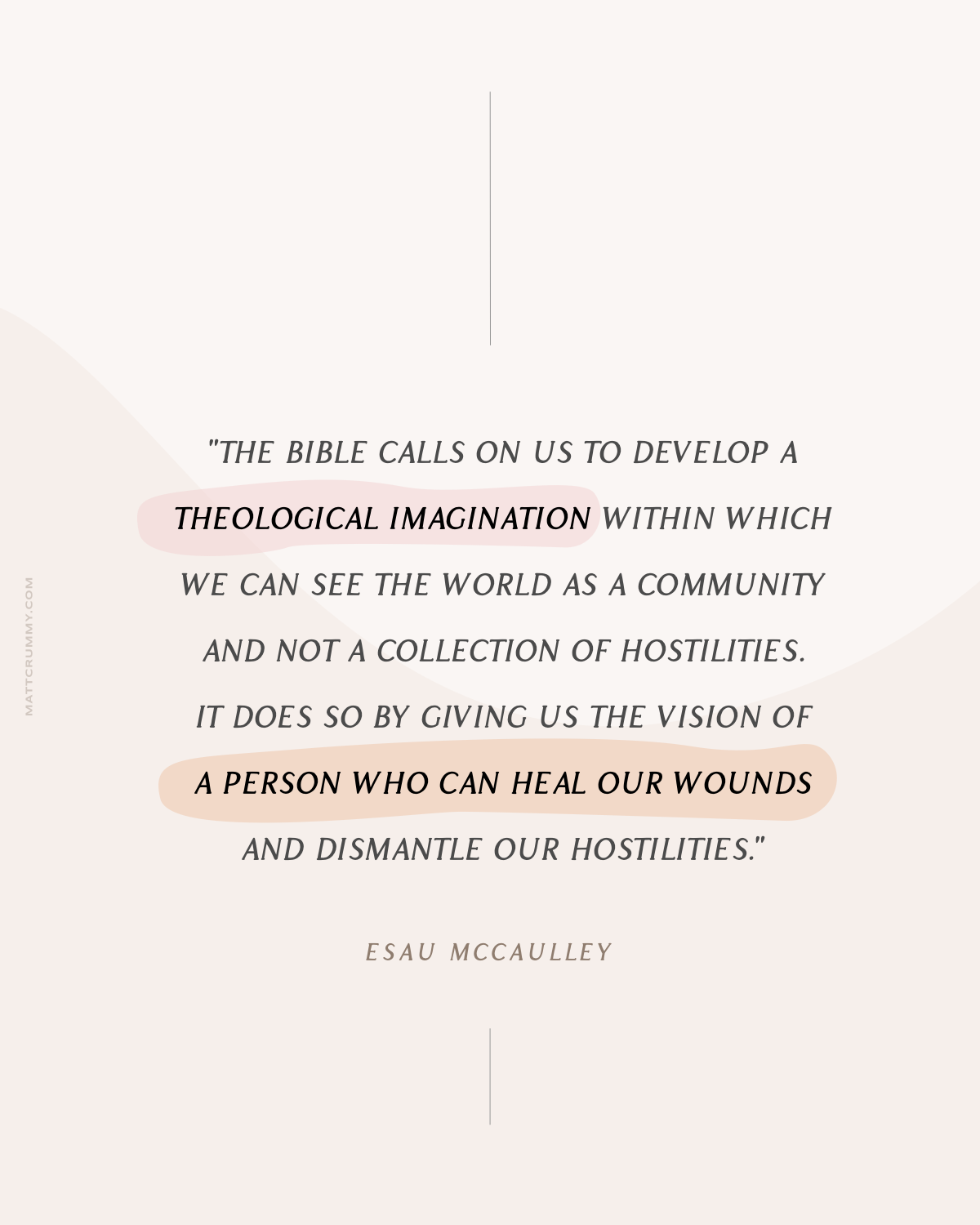 "What brings the warring parties of the world together is not the emergence of a new philosophy of government; it is not free market capitalism, communism, socialism, or democracy. It is a person: the root of Jesse. Isaiah then calls for Black people, in the midst of their pain, to begin to envision a world not defined by our anger. The Bible calls on us to develop a theological imagination within which we can see the world as a community and not a collection of hostilities. It does so by giving us the vision of a person who can heal our wounds and dismantle our hostilities."